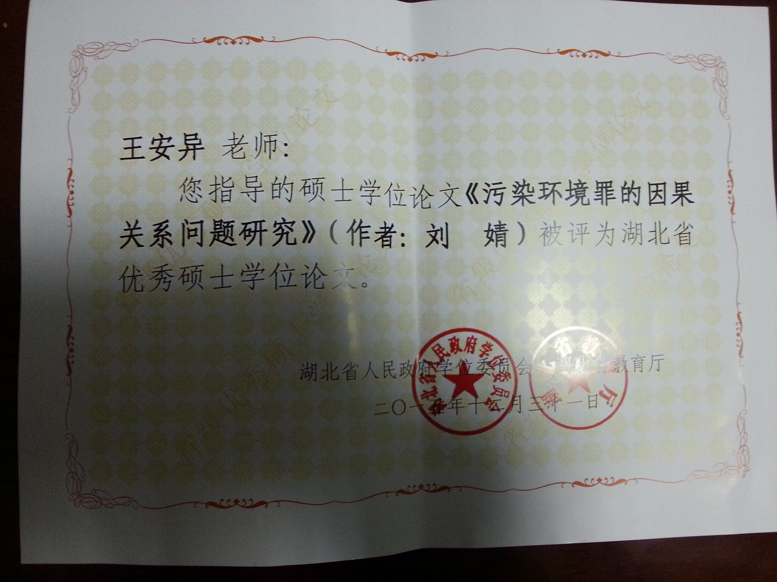 日前,2015年湖北省优秀博士论文和硕士学位论文评选结果揭晓,永利官网2011级刑法学硕士研究生刘婧的《污染环境罪的因果关系问题研究 》(指导教师王安异副教授)被评为2015年湖北省优秀硕士学位论文。