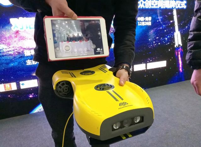 深圳潜水侠创新动力科技有限公司展示了研发的首款采用QAS-Balance四函道技术的可稳定悬停拍摄4K视频的便携式水下无人机--潜水侠“Nemo”,可轻松下潜到水下100米。操作者无需下水,采用手机app可轻松操控,结合体感VR,有更加身临其境的感觉。可以水下物证搜索、尸体打捞、水下搜索救援、船舶检测等应用中大显身手。