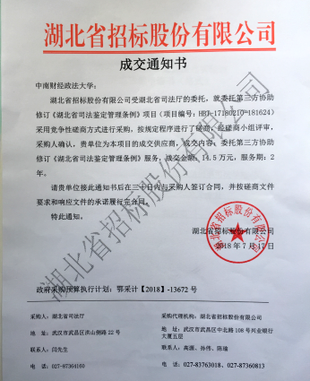 湖北省招标股份有限公司受司法厅的委托,采用竞争性磋商方式采购《湖北省司法鉴定管理条件》修订项目(项目编号:HBT-17180210-181624)。永利官网胡向阳教授组织的竞标团队按照招标规定程序接受几轮专家的质询,最终被确认为中标团队。2018年7月17日湖北省招标股份有限公司发来中标通知书,项目研究经费14.5万元。