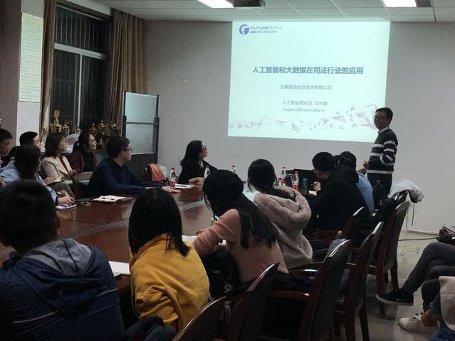 讲座伊始,司华建总监就安徽富驰信息技术有限公司做了简要介绍,富驰信息是专注于司法大数据与人工智能应用研发的公司,是国内较早致力于司法业务量化分析研究、以法理与实务为基础为司法机关提供大数据服务的企业之一,业务着重在为法院、检察院、监察厅、司法厅等部门提供大数据分析、人工智能行业场景应用。