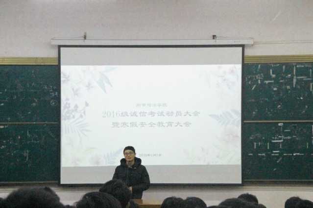 新闻网讯(通讯员 杜诗宇 姚元辰)2018-2019学年第一学期即将结束,寒假即将来临,永利集团88304官网2018-2019年第一学期2016级诚信考试动员大会暨寒假安全教育大会在电教楼103召开,16级公安专业辅导员卓张鹏老师主持大会。16级全体公安专业学生听会。