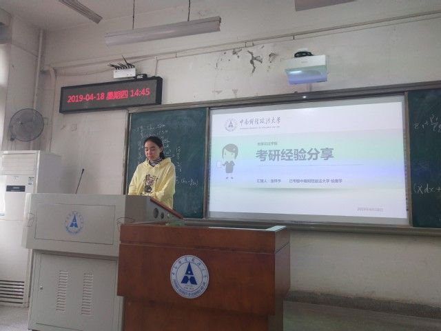 其次进行分享的是张铧予同学,她首先从人生道路的选择告诉大家不只有考研这一条路,要结合自身进行明确的定位。然后从考研的不同科目一一进行了讲解,以及不同题型如何训练和考试中的时间安排问题。最后还给出几点小贴士:要劳逸结合,多运动,心态很重要。