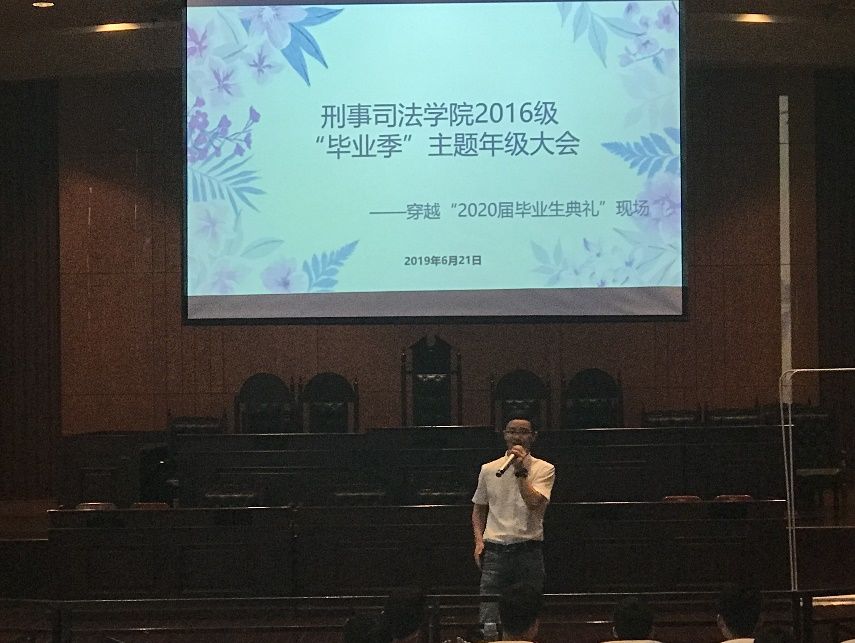 6月21日下午两点半,永利集团88304官网2016级“毕业季”主题年级大会在文泰模拟法庭(一)召开。开头描述的,是每个面临毕业的学子将经历的毕业典礼场景,更是本次主题年级大会中,卓张鹏老师让每位同学闭上眼睛,“穿越”一年后的毕业典礼场景。