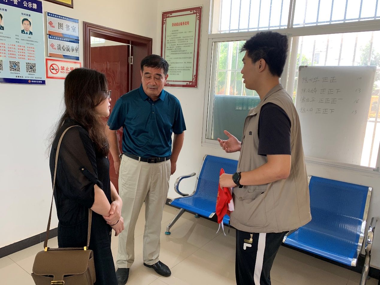(图为调研团队成员在魏河村支部与当地村干部交谈了解大概情况)