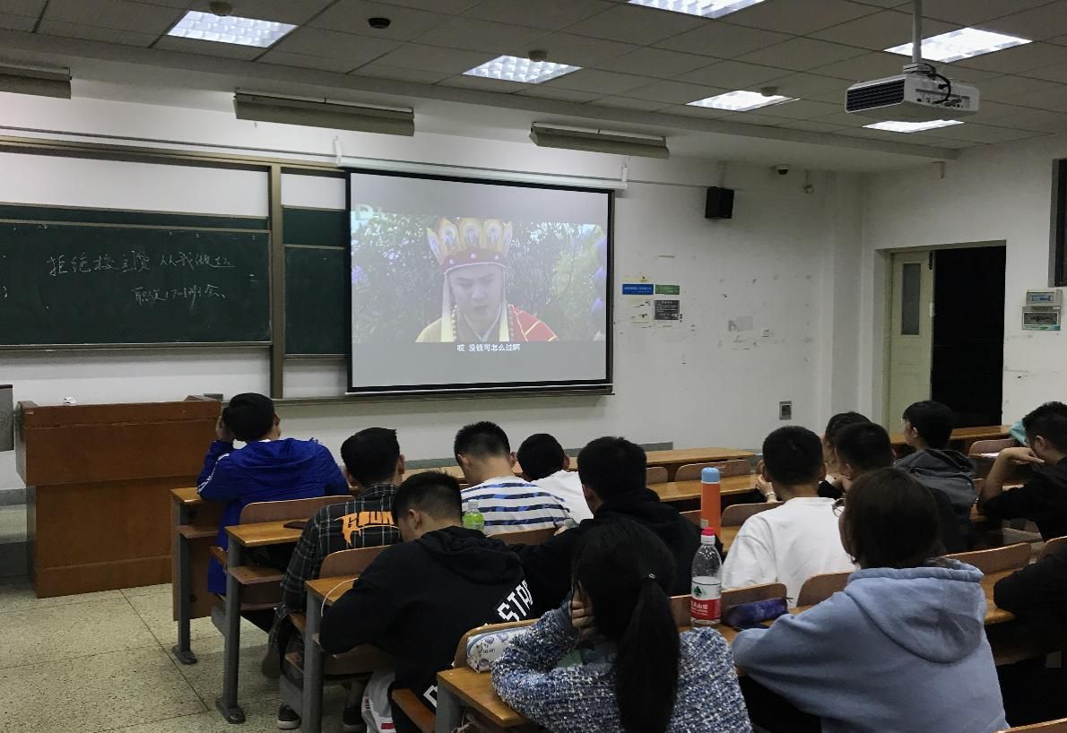 两位同学发表自己的看法过后,班会进入到播放宣传视频环节——由朱桉毅同学提前准备的《西游记之防范校园贷》趣味视频。视频以师徒四人取经为背景,通过台词改编和配音,讲述了师徒四人陷入“非法校园贷”的危机,为此面临重重困境的故事。故事的最后,一位好心人劝说师徒四人回心转意,遗憾的是,他们已被非法机构误导,踏上了不归之路,后果不堪设想。