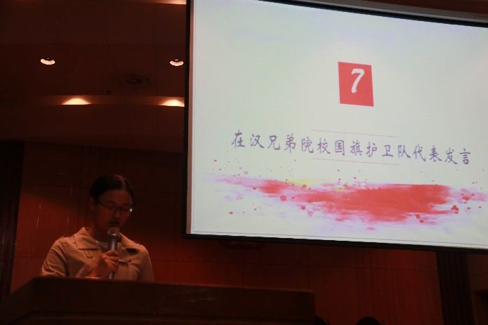 随后,校团委组织部部长韩畅发言,他表示了对国旗护卫队未来发展的美好祝愿。武汉纺织大学国旗护卫队代表也表达了对队伍的衷心祝愿及两校友谊长存的期冀。接下来,队长刘嘉斌对上年工作做出总结。