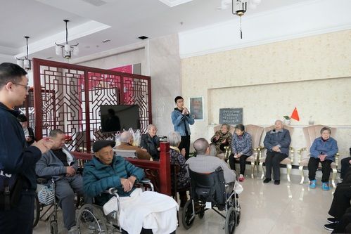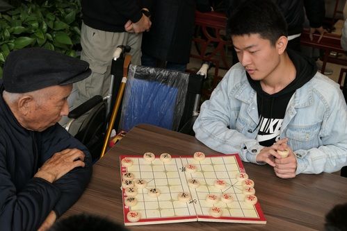 走进养老院,很多老人还未起床,于是同学们在郭老师的组织下先行开了一个短会,再度明确当天活动流程并对为老人们所准备的节目进行了梳理。时间来到8点半,老人们纷纷从楼上休息区来到楼下,同学们则主动上前协助养老院护工帮助老人就座,两支队伍逐渐融成一支,同学们或与老人闲话家常,或与老人下棋谈心,有说有笑中一楼大厅的气氛慢慢热络起来。