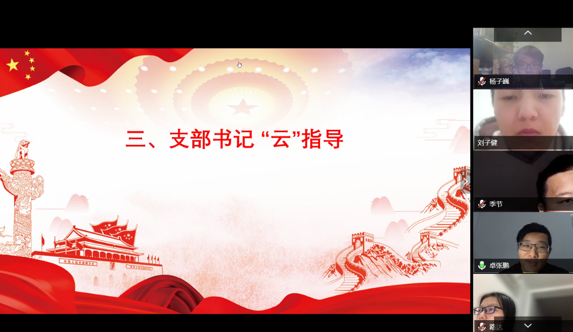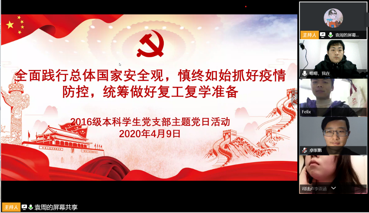2016级本科学生党支部全体党员于4月9日晚7点利用腾讯会议平台进行线上主题党日活动,包括抗疫志愿“云”分享、主题学习“云”讨论、支部书记 “云”指导三个部分。