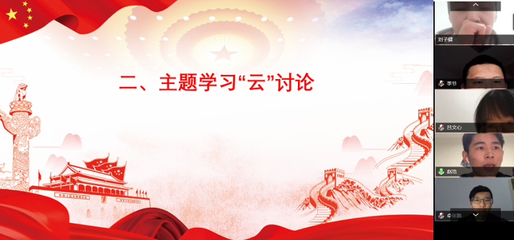 第二部分,主题学习“云”讨论。参会人员根据本次主题党日活动的学习内容,结合学生党员的实际进行分享讨论。赵浩同志谈到:“习近平主持召开中央全面深化改革委员会第十二次会议强调完善重大疫情防控体制机制、健全国家公共卫生应急管理体系、把生物安全纳入国家安全体系,此次新冠肺炎来势凶猛,无数仁人志士忘我奉献,奋战一线,甚至付出生命,于此同时也有社区村庄基层服务工作者进行这信息统计、用品采买、隔离监督等抗疫相关工作,他们的工作平凡、甚至有人对他们产生抵触情绪,但事实上平凡的岗位上的他们做着伟大的事情。也在为国家安全做着自己的贡献。”袁周同志分享:“今年是充满危机的一年,考研人数增长了几十万人,升学形式紧张;春招岗位数目据不精确统计,比去年少了一半。但我们也要看到,我们的党和国家,在这个艰难的时刻,带领全国人民控制住了新冠病毒的疫情,也给我们毕业生出台了许多相关的政策,帮助我们升学就业。在本次党日活动的学习材料中,习近平主席指出,危和机总是同生并存的,克服了危,即是机。在毕业生的就业升学工作中我们党员在这个时候如何发挥自己的价值,是需要我们每一个人思考的。借着学习材料中的内容,我认为我们应该做到以下两点:一、要深入分析,全面权衡,二、准确识变、科学应变、主动求变。”