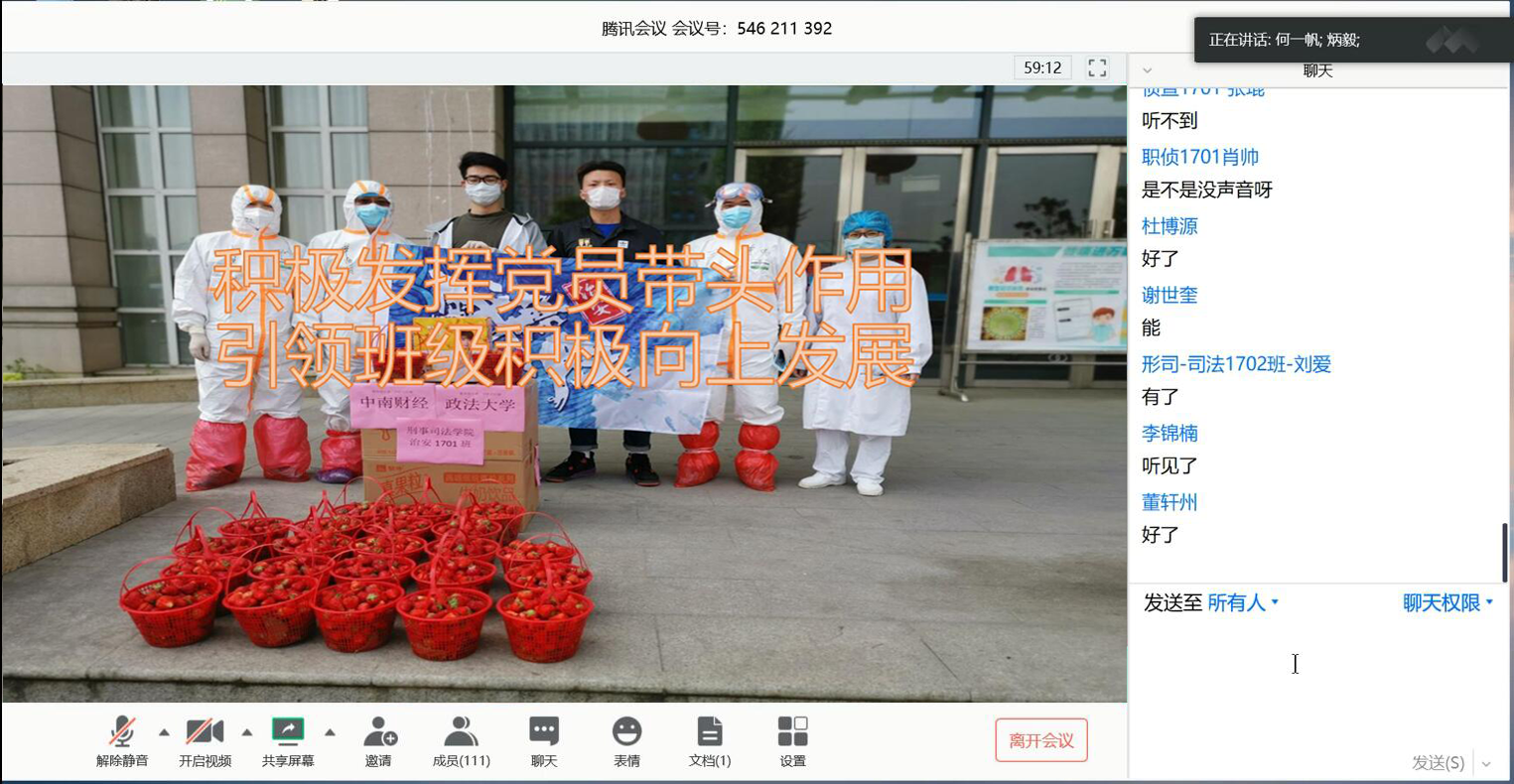何一帆同志介绍了治安1701班向抗疫单位捐赠爱心物资的事迹,他们自筹1881元,向武汉市蔡甸区人民医院(协和江北医院)、蔡甸区疾控中心和玉贤街派出所捐赠一批爱心物资,并向坚守在一线的工作人员表示感谢。