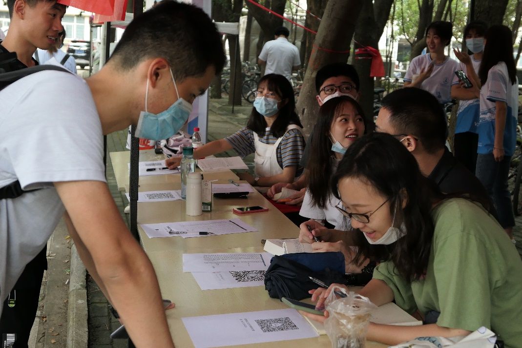 迎新志愿者徐淇钰向我们具体介绍了对于本次迎新活动他们前中后期准备,迎新志愿者们在暑假就开始线上选拔,上岗后和对接的师弟师妹们取得联系并解疑答惑。“虽然很辛苦,但是能帮助到师弟师妹们我就感到很荣幸与开心”,这是她对此次迎新活动最大的感受。