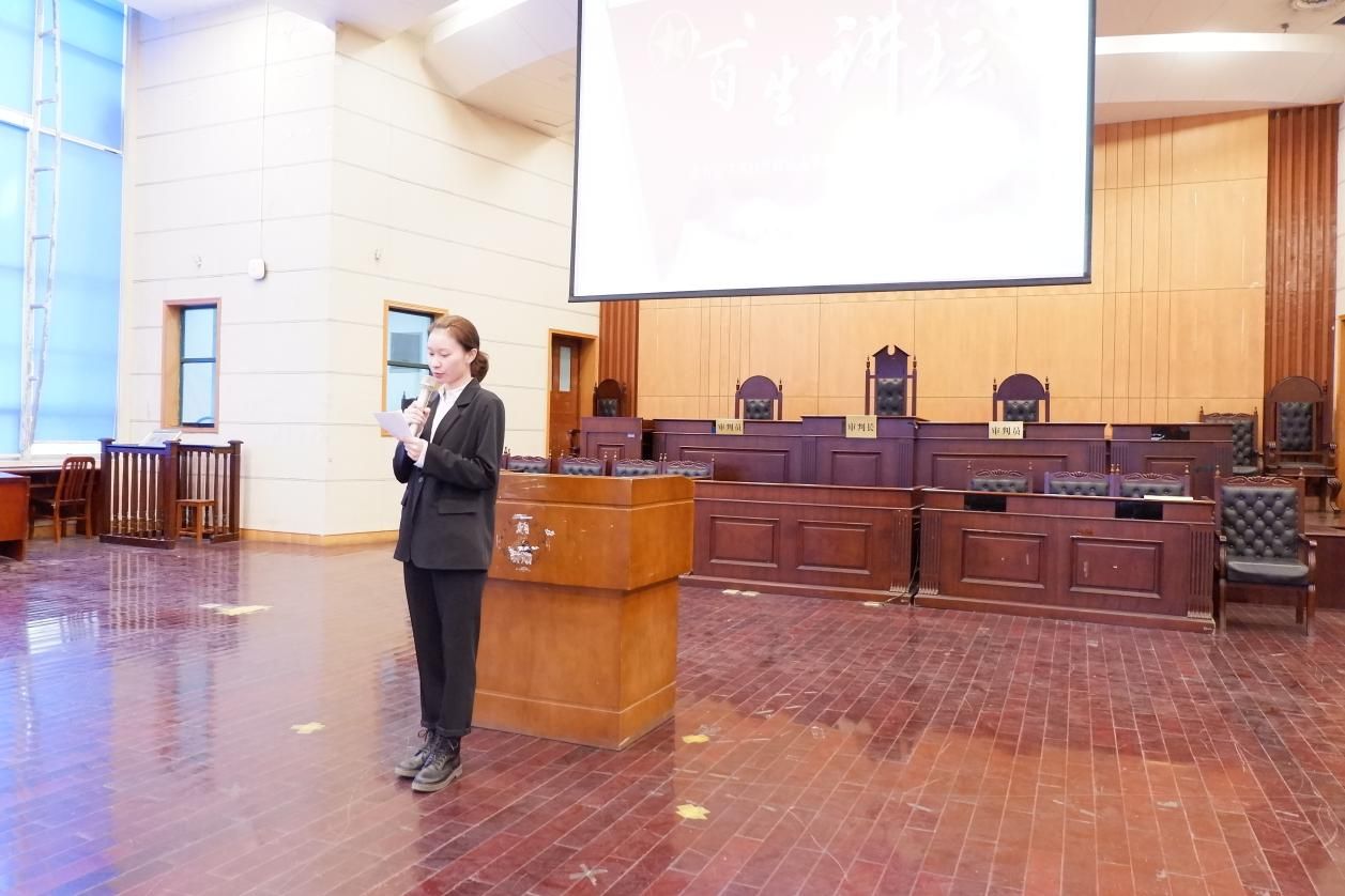 活动伊始,全体师生起立奏唱共青团团歌,模拟法庭的气氛一时变得肃穆凛然起来。奏唱团歌之后,参赛选手依次上场演讲。参赛选手激情洋溢地讲述了新冠肺炎疫情背景下中国人民抗疫的艰辛时刻与伟大斗争,饱含深情地讲述了英雄故事与抗击疫情的光荣历程……选手们精彩的演讲赢得了台下同学们阵阵热烈的掌声。各位主讲人从不同的角度讲解了平凡人们在疫情发生之时所付出的艰辛努力,赞扬了他们不平凡的献身精神和团结一心、不畏艰难的爱国行、爱国情。帮助同学们树立远大理想,增强进取意志和奋斗精神,激励广大青年师生将爱国之情、报国之志和强国之梦融入到祖国改革开放发展的伟大事业之中,融入到抗击疫情的时代历程之中。