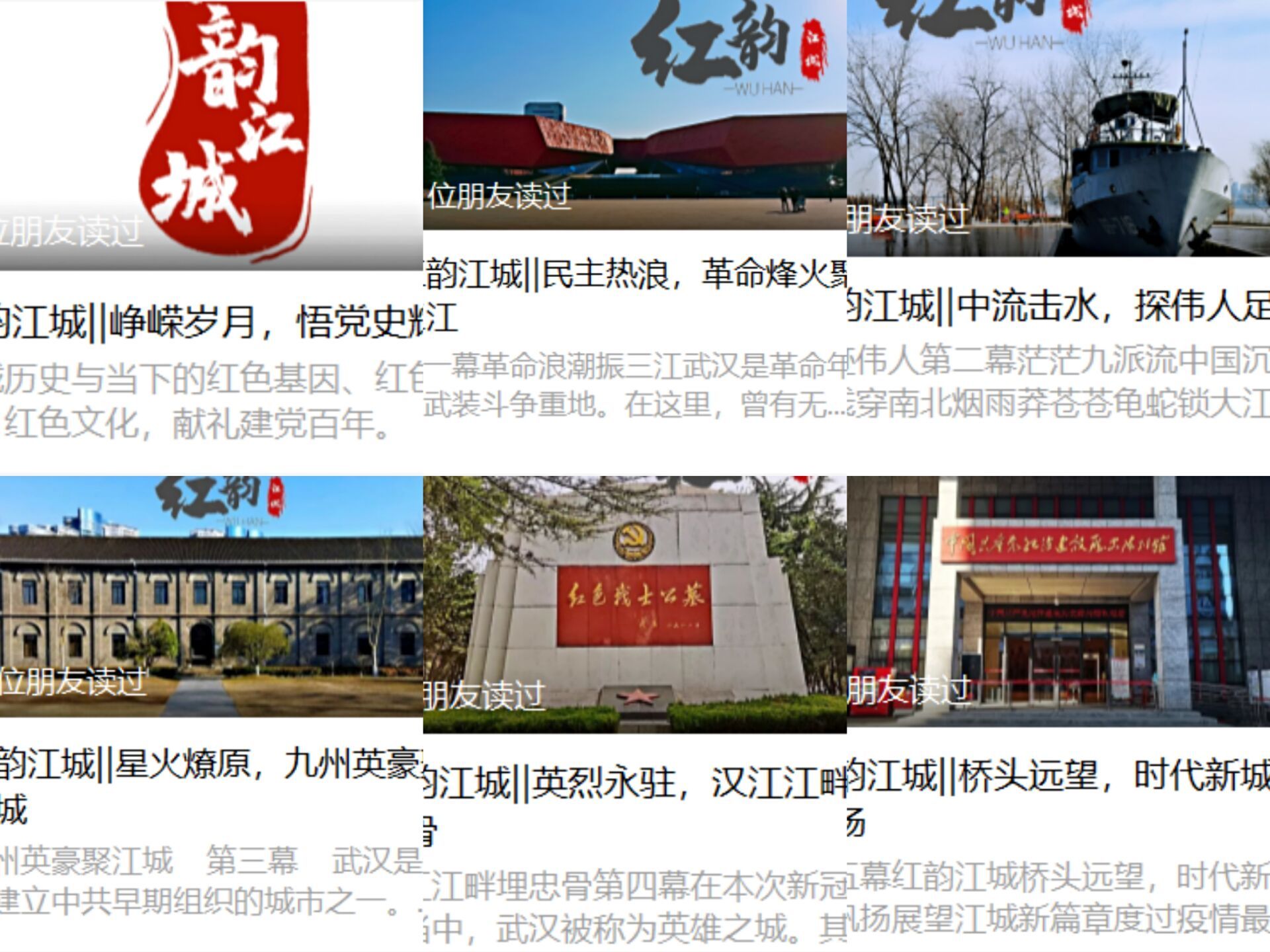 小队打造了专题集锦型特色宣传模式,拥有着独立运营的红色文化品牌公众号“红色江城”,我们将武汉的大部分红色景点分专题地向大家诠释。我们共分为“革命浪潮振三江”“伟人足迹”“九州英豪聚江城”“汉江江畔埋忠骨”“展望江城新篇章”五幕,运用文字、图片、视频、录音等多种形式为大家展现立体的红色文化。不仅如此,我们也结合疫情背景与大家一起讨论景区安全防控经验,交流红色景点的场馆设计与创新,针对相关问题设计问卷并呈现数据,同景区工作人员进行交流专访等,为大家展现武汉真实的“红色进行时”。