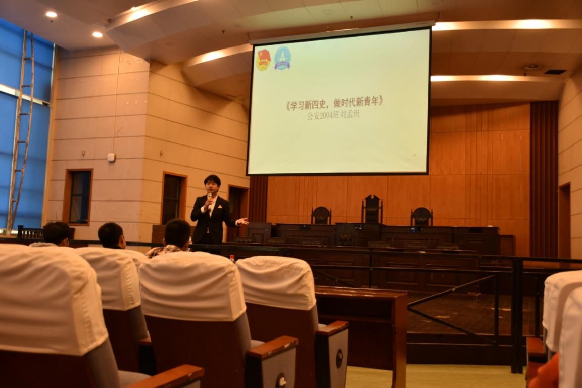 其中,公安2004刘孟坦从历史到现实,从国内到国外讲述了学习新四史,做时代青年的伟大志向。他用抑扬顿挫的声音、铿锵有力的话语、鼓励人心的背景音乐、充满感情的肢体语言表达了对中国共产党的敬佩,对四史的理解,激起了台下观众共鸣。