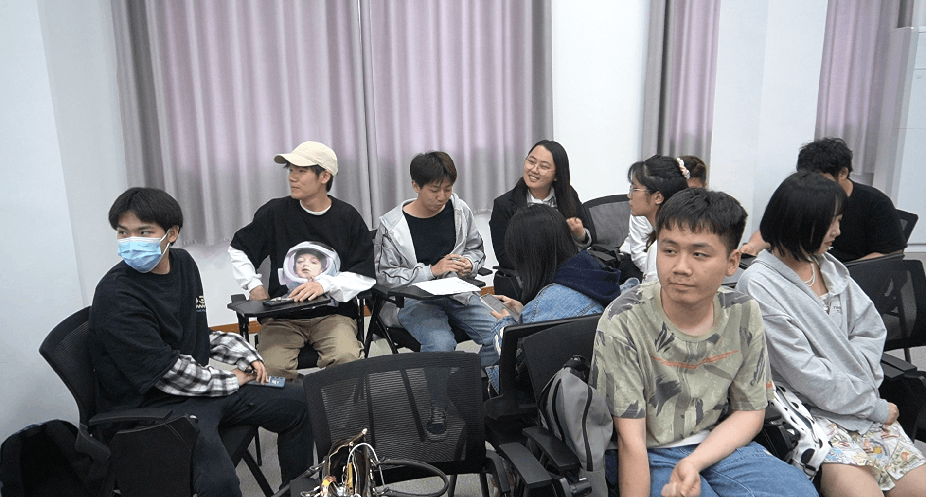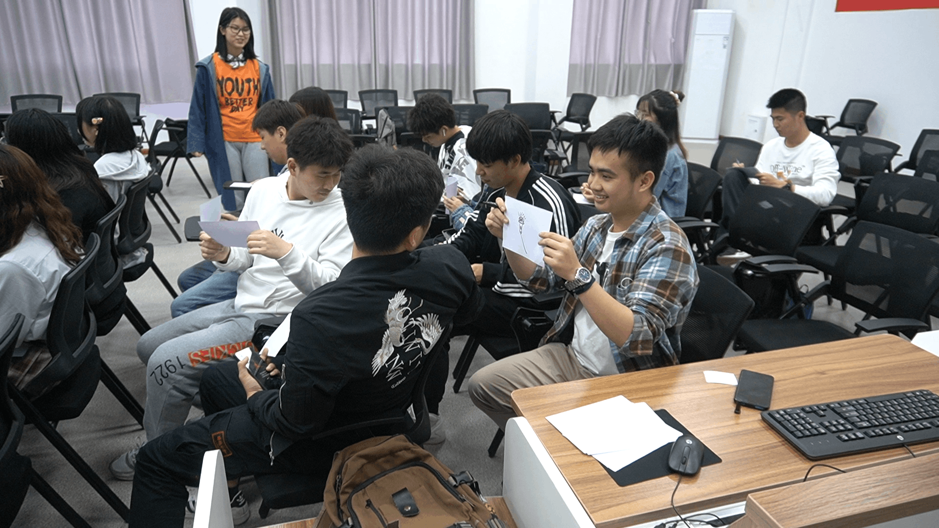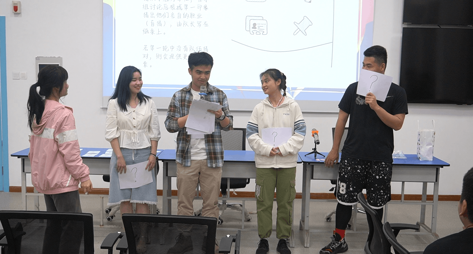 接着,视频引导“警员们”来到“樱花教堂”。在这个环节中,同学们进入“真人猜职业”的游戏挑战环节。讲台上的两名男生、两名女生扮演幼儿园老师、司机、护士和程序员。规则为同学们分别根据第一印象和给出的线索,猜出台上同学分别扮演的四种职业。在激烈的讨论和烧脑的比拼中,同学们运用精湛的逻辑推理分析能力,运用排除法推理出了四位“神秘人”各自扮演的职业。同学们在讨论中锻炼了人际沟通的能力,也通过答案的揭晓明白了职业刻板印象会影响判断,进而影响沟通的道理。