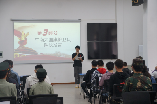 稍作休息后,大会进行第四项,中南大国旗护卫队进行国旗文化论坛作品展示,由中南大国旗护卫队宣讲团带来“学习英雄故事,宣扬国旗文化“的主题演讲。20级队员王思妍向在座战友讲述了帕米尔雄鹰——拉齐尼·巴依卡一家三代为国戍边的故事。情感饱满的演讲打动了不少战友,英雄的故事让在场的人都为之动容。
