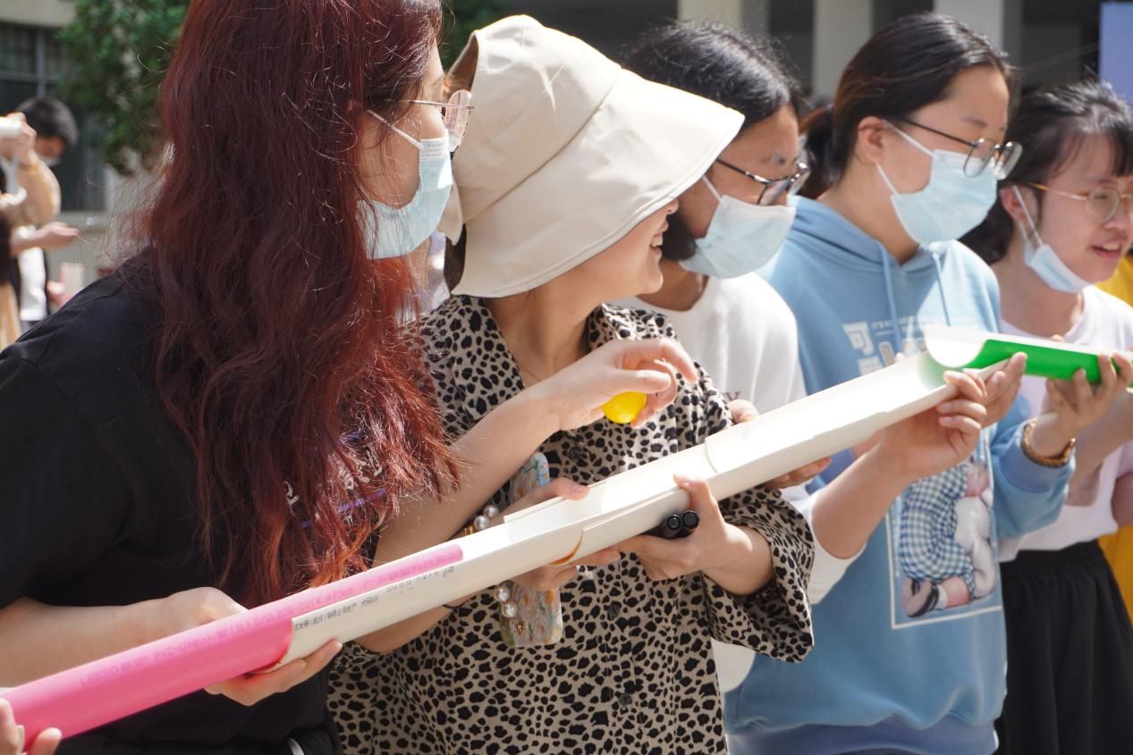 在挑战环节“珠行万里”中,每组队员一字排开,每人手拿一根球槽,将球连续传递滚动到下一个队员的球槽中,并迅速地排到队伍的末端,继续传送前方队员传来的球,直到球安全的到达指定的目的地为止。如果中途球掉落在地,则要返回原地捡起球重新挑战。一开始同学们手中的球纷纷掉落,但是经过小组激烈的讨论后,每个小组都商量出了改进策略,掌握了要领。在比赛过程中,各小组衔接得当、高效配合。虽然中途出现球落地的情况,但他们一鼓作气、振作精神,不松懈、不放弃,圆满地完成了各自的比赛任务,培养了团队集体意识和荣誉感,彰显了团结友爱的集体形象。整个活动的氛围也在此挑战中达到了高潮!