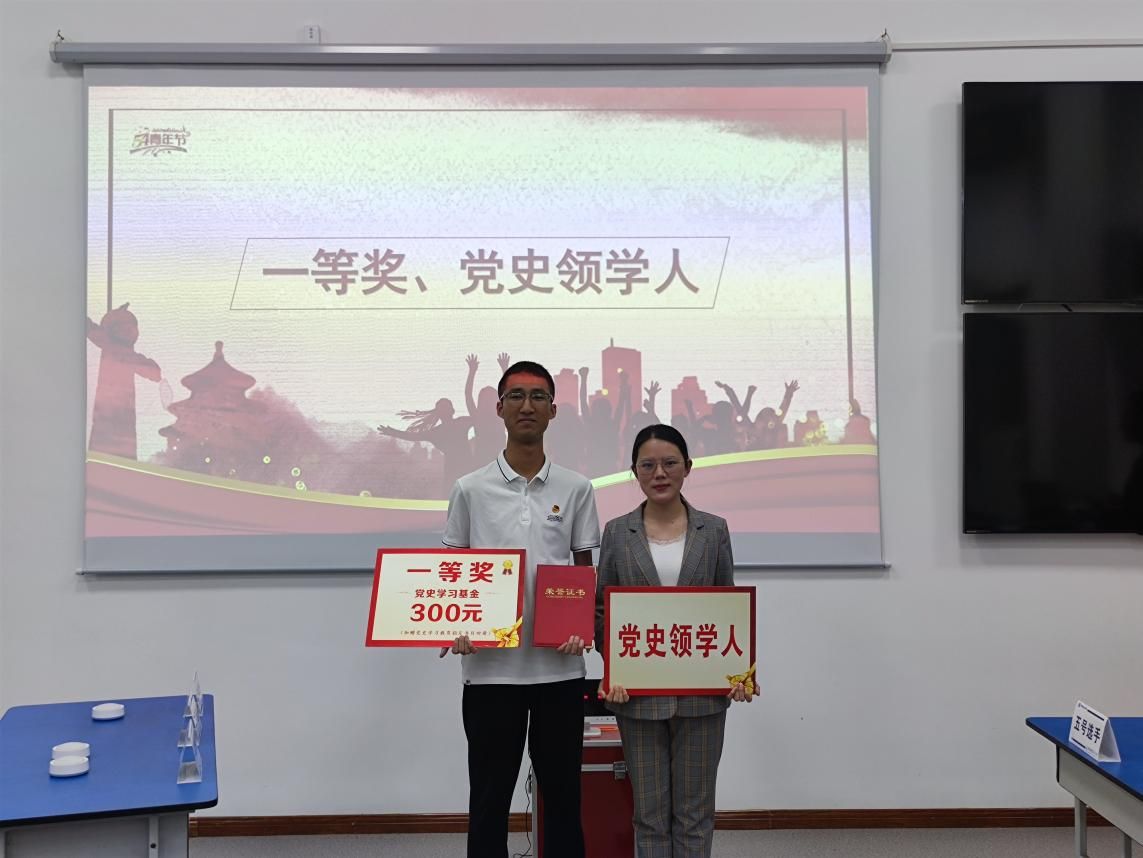 最终,马闻泽同学获得了一等奖,同时被授予“党史领学人”称号,李帅同学、陈曌浒同学获得了二等奖、郭东梁同学、张子逸同学、陈怀宇同学获得了三等奖,孙凯鑫同学、吴祖昊同学、王贤彬同学、倪昀韬同学获得了优秀奖。李淑兰老师、周洲、刘雨辰、高烨晗评委为获奖人颁奖并拍照留念。