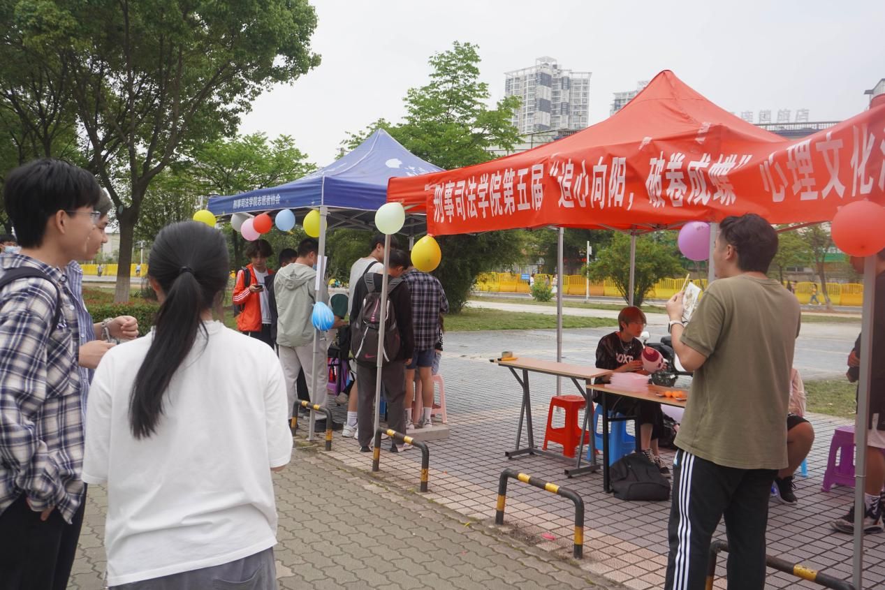 侦查1901、公安2001小组设计并展示了正话反说、给“卷王”贴鼻子的小游戏。在正话反说环节中,参与的同学们通过将主持人所念词句依照反向顺序大声念出的形式,提高了反应力与思考应变能力,同时也让参与者更加熟悉和了解我们心理文化活动节“破卷成蝶”的主题。在给“卷王”贴鼻子的环节,参与者各自原地转三圈,然后在卡纸上卡通人脸的鼻子中央贴上小纸片,表示给“卷王”贴上鼻子。这个游戏设计别出心裁,吸引了许多过路同学的目光。参与者通过贴鼻子的游戏释放了内卷压力,也锻炼了手脑平衡。