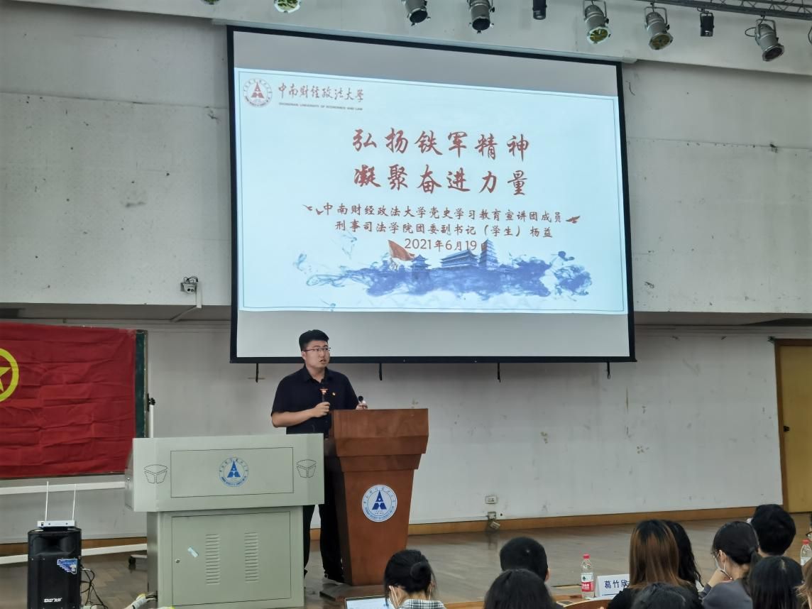 接下来,杨益同学以铁军精神为切入点,向我们讲述了独立团与新四军的羁绊,铁军精神的传承。杨益还向我们阐释了铁军精神的内涵,并以自身的在辩论队、纪律监督部的工作经历分别联想到铁军的担当、斗争、纪律精神,提倡做好学习与工作的权衡,帮助团学骨干们凝聚力量、传承铁军精神,并呼吁广大学生骨干参与到校内外的活动当中,运用各种资源去创新进步,提升创新能力。
