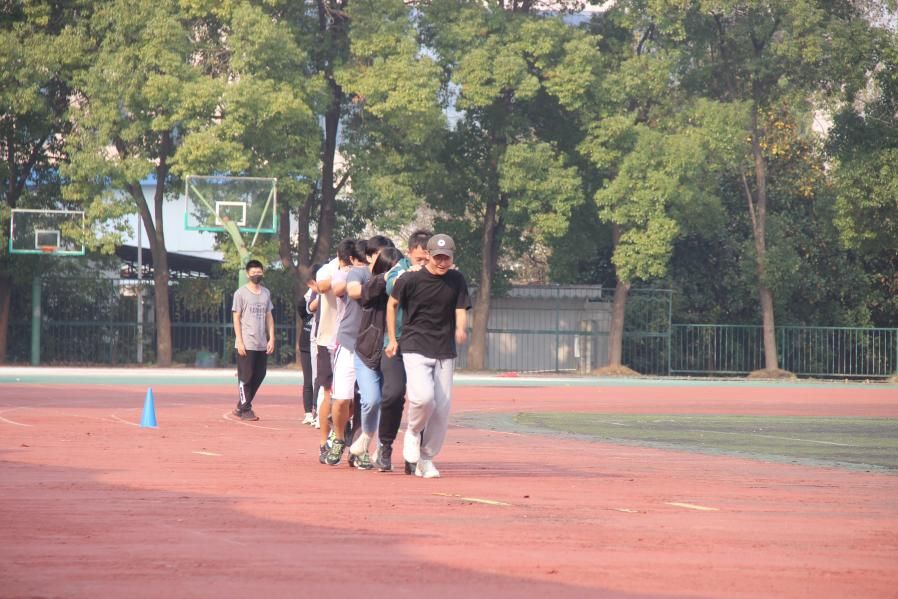与迎面接力类似,时代列车项目更追求速度与协调,每个选手手搭在前方队友肩膀上,奋力冲刺,实现群体速度的累积。当团队如同一辆列车驶过时,每位成员作为相互搀扶的伙伴,展现出了“心往一处想,劲往一处使”的团队风貌。