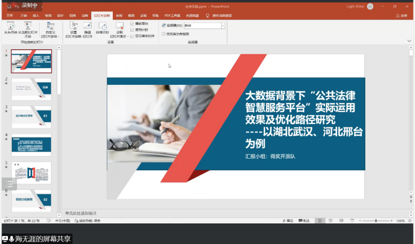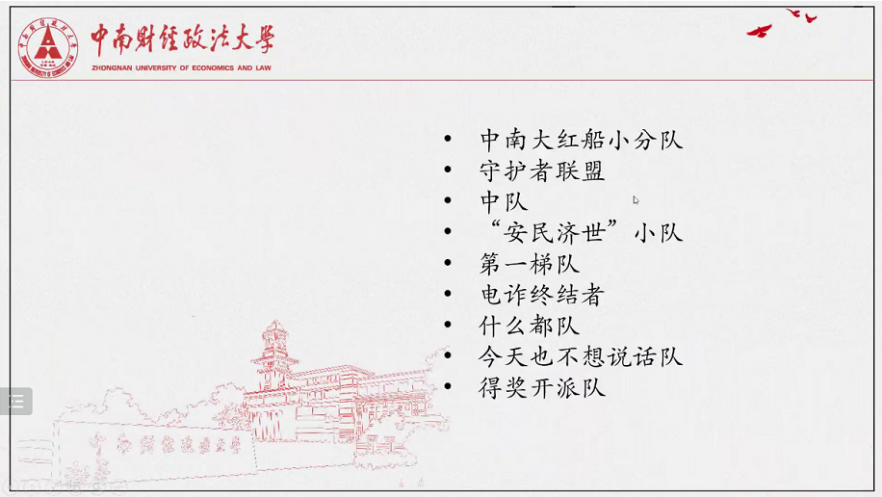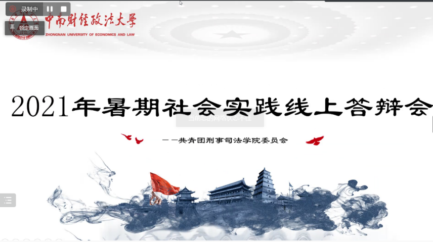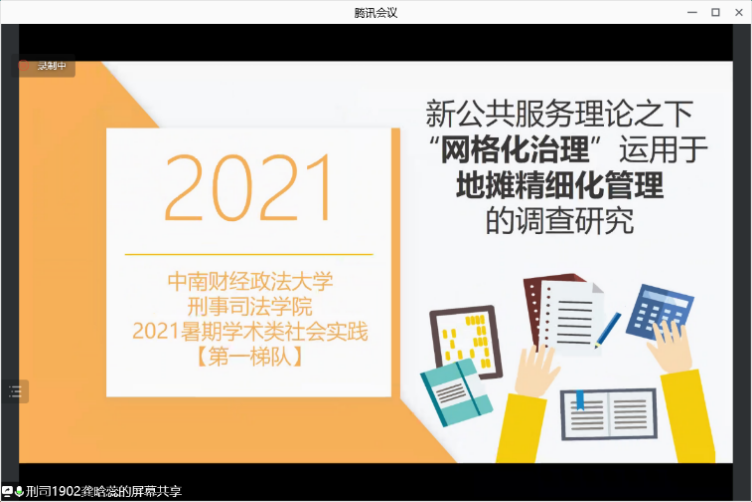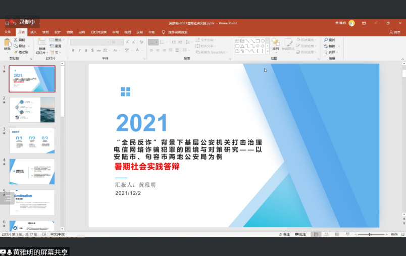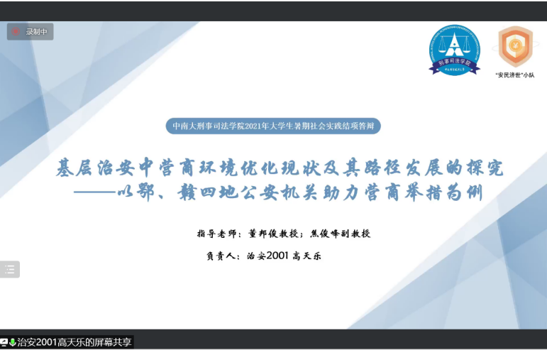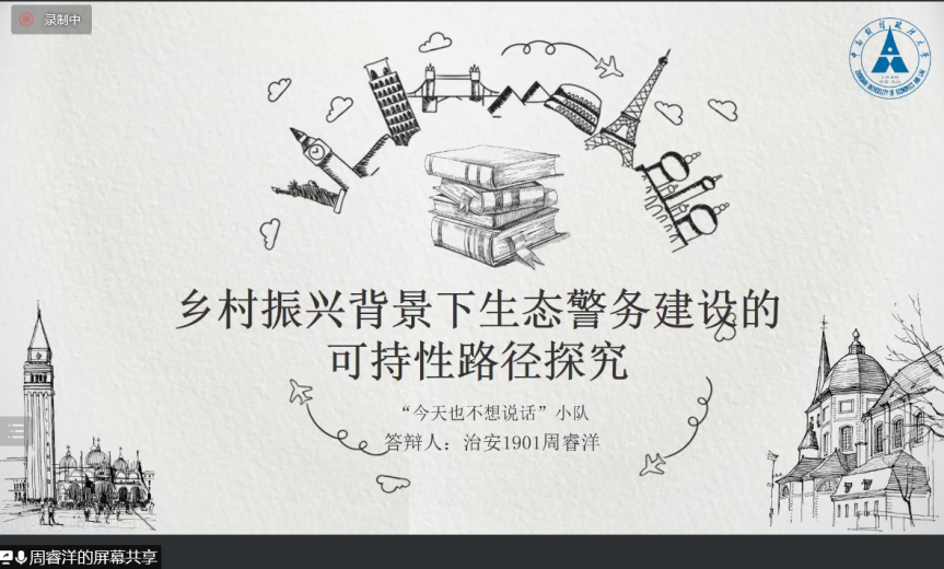 在线上答辩环节中,各位答辩人向评审组与同学们展示了《“红船精神”融入新时代青年理想信念教育》《侵害未成年人案件强制报告制度背景下公安机关主体作用的实证性研究》《疫情防控常态化下加工制造业恢复和发展对策分析》《基层治安中营商环境优化现状及其路径发展的探究》《新公共服务理论之下网络化治理运用于地摊精细化管理的调查研究》《全民反诈背景下基层公安机关打击治理网络诈骗犯罪的困境与对策研究》《治安防控中人脸识别技术应用的平衡与冲突研究》《乡村振兴背景下生态警务建设的可持性路径探究》《大数据背景下公共法律服务智慧平台实际运用效果及优化路径研究》共九个主题的暑期社会实践研究成果。各小队通过文献研究、问卷调查、线上线下访谈以及数据分析等多种形式进行调研,以详细的PPT、流利的答辩演说、精彩的活动过程记录来完成了小组的结项答辩,对新时代下思政教育、治安综治、犯罪防控、疫情管理等热点问题做出了深刻的研究与探讨。