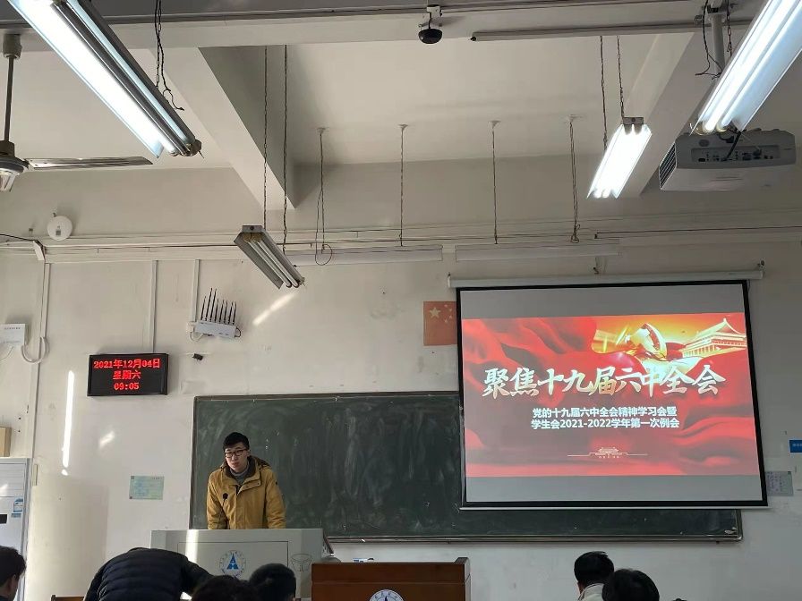 致辞完毕,会议进行第二项,由学生会各部门分享党的十九届六中全会精神的学习心得。各部门代表指出了党十九届六中全会精神的核心内容,分别讲述了每个人不同的学习感悟,表示会不懈坚持学习我党精神,使党的精神永驻心中,永葆活力;同时倡导我们每一位同学领悟我党精神的引领作用,认识到学习党的精神的重要性,在此基础上,积极学习党的精神,用正确的思想武装自己的头脑,回望过去,展望未来。