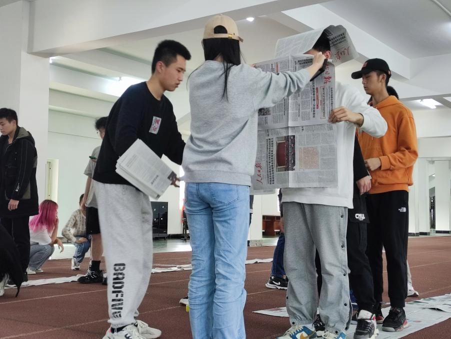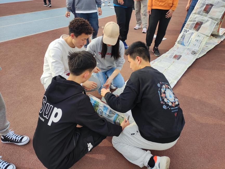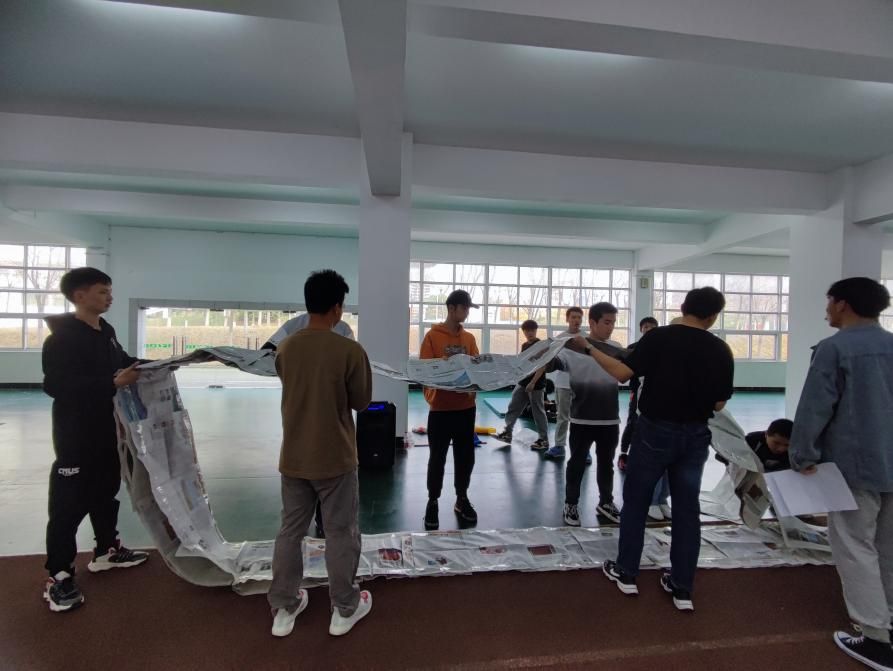 车轮滚滚则是用报纸和胶带制作一个封闭大圆环“风火轮”,每组成员需要用需要计算出适合本组的报纸数量,进行合理的资源分配。每队各有同等报纸剪刀和胶带, 制作好之后,全体队员站在立起的圆环内,边走边滚动并使“风火轮”运行一个来回。制作和比赛总计用时最短的组获胜。比赛紧张刺激,队员们喊着口号一齐向终点发起冲刺。活动氛围达到了高潮。