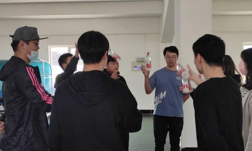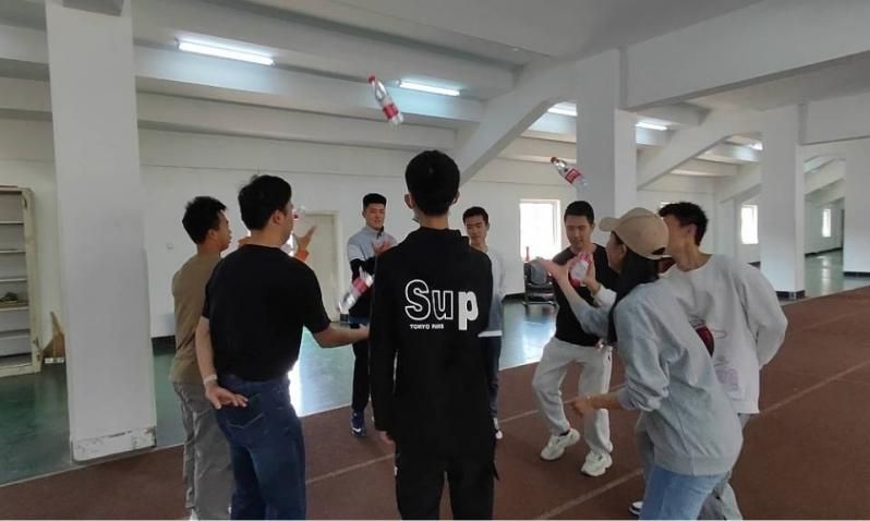 接下来是破冰环节“能量传递”,规则为队伍围成一个圈,每个人把矿泉水瓶不断拋给右边的人,同时接住左边的瓶子,形成一个循环。在连续十次不间断,瓶子不掉落的情况下,视为挑战成功。在素拓活动带领员潘左成的指导下,各组开始了一次次尝试——从手忙脚乱到熟练连抛,熟能生巧在这个环节中得到了印证。每队在练习时都非常投入,通过团队协作不断磨合默契。最终每个组也都顺利完成了破冰任务。一个看似简单的游戏其实包含了许多技巧,考验着团队的默契。