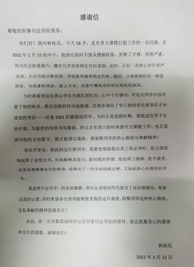 新闻网讯(学生记者 金雯星 喻宇轩 齐敬凯 黄岚 高天乐)3月22日,刑事司法学院收到了一封感谢信,来信者是在我校后勤服务保障中心工作了二十余载的林桂花阿姨,她在信中表达了对学院黎国成同学倾情相助的感谢,赞扬了黎同学热心向善的可贵品质,高度评价了刑司学院对青年的思想道德教育与培养。