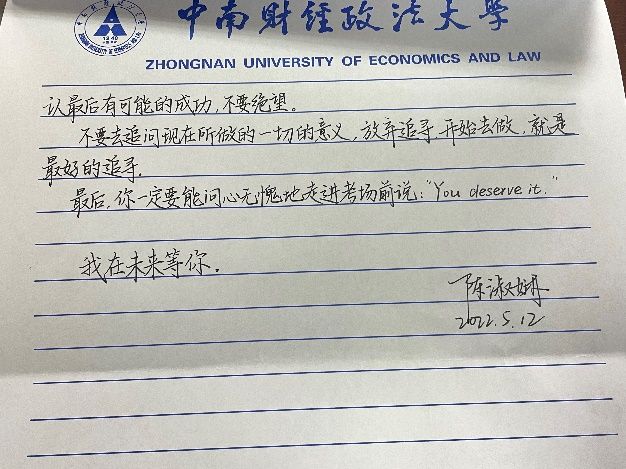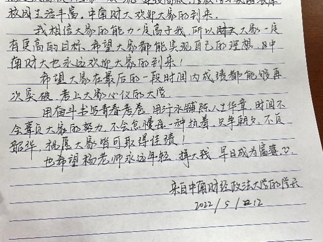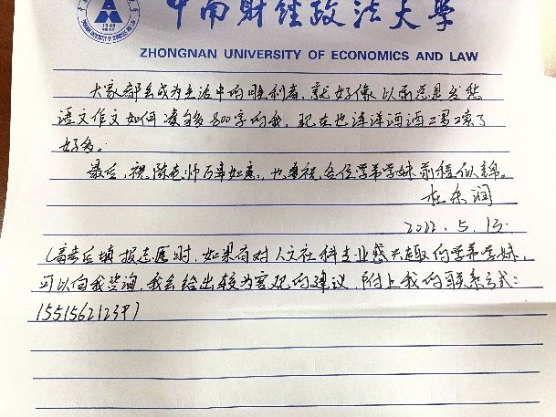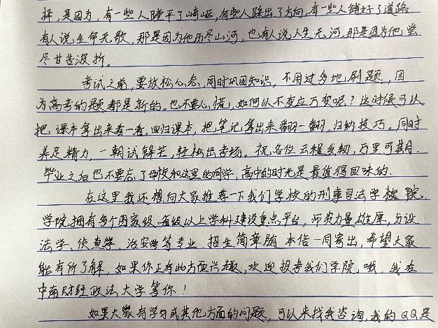 本次活动由“一字班”同学们自行联系高中母校班主任,通过写信的方式对学弟学妹进行鼓励,分享学习经验,展现中南大浓厚的学习氛围和精彩的校园生活。