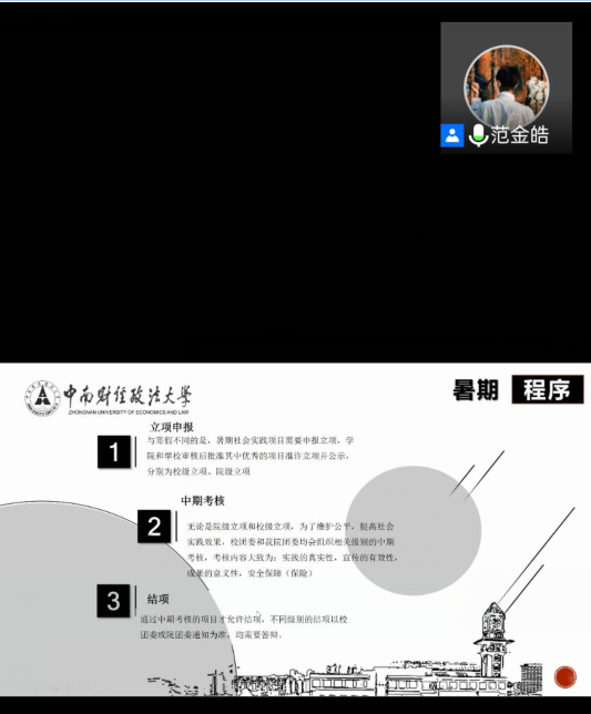 最后,由创业实践办公室负责人范金皓对社会实践进行解答说明。首先他对暑期社会实践相较于寒假社会实践的不同点作出说明,随后对整个暑期社会实践的过程做出了详细的介绍,并对于整个的暑期社会实践的评优评先规则进行整体说明。同时,他就本次暑期社会实践有关公共必修课的学分制度相关问题进行了解释说明,最后他强调了暑期社会实践中可能涉及到的部分细节性注意事项,提醒同学们暑期社会实践注意遵守当地疫情防控有关政策,原则上购买相关保险,注意活动中的人身安全,并预祝各分队的社会实践取得圆满成功。