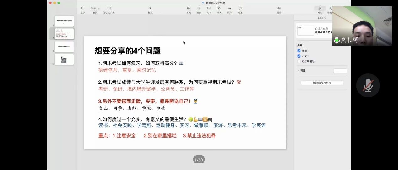 大会最后,郭老师公布了暑假放假安排并强调了相关注意事项。对于离校工作,郭老师指出同学们需要注意宿舍卫生,做到文明离校。假期间,同学们要合理规划时间,提升自我、劳逸结合。参加社会实践的同学注意自身防护,鼓励线上线下相结合,严格遵守当地疫情防控制度。在暑假,完成社会实践与人身财产安全相统一、志愿服务与科研成果转化相统一、理论学习与自我规划发展相统一、技能培训与自我规划发展相统一、技能培训与自身兴趣爱好相统一、家校联动与人格品行修炼相统一。