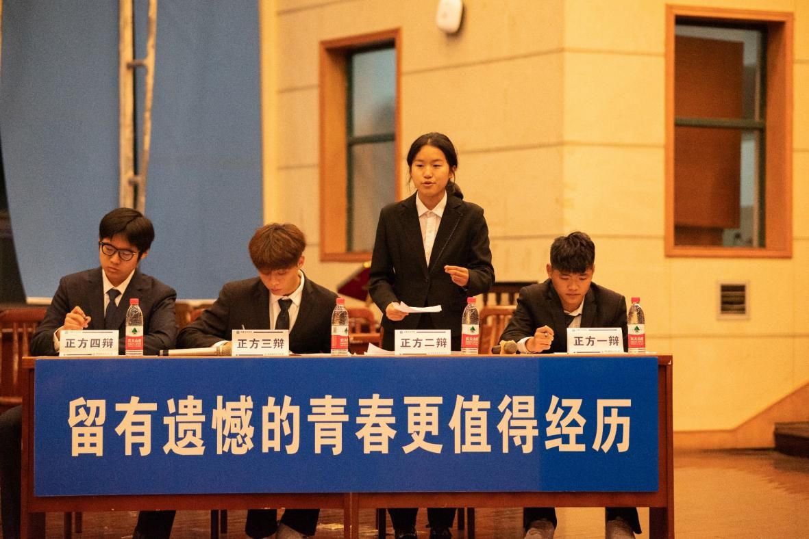比赛中,双方慷慨陈词、互不相让,言语的激烈交锋让在场观众感受到辩论赛紧张的气氛。立论陈词环节,正方辩手持“留有遗憾的青春更值得经历”的观点,向反方强调,遗憾是青春的必经之路,遗憾使人坚强,催人成长,我们只有经历了遗憾才能成为更好的自己。反方辩手不甘示弱,在提出“不留遗憾的青春更值得经历”观点的同时,假设了一个“理想王国”来支撑己方的陈词,更在辩论中引经据典,博得在场观众的阵阵掌声。