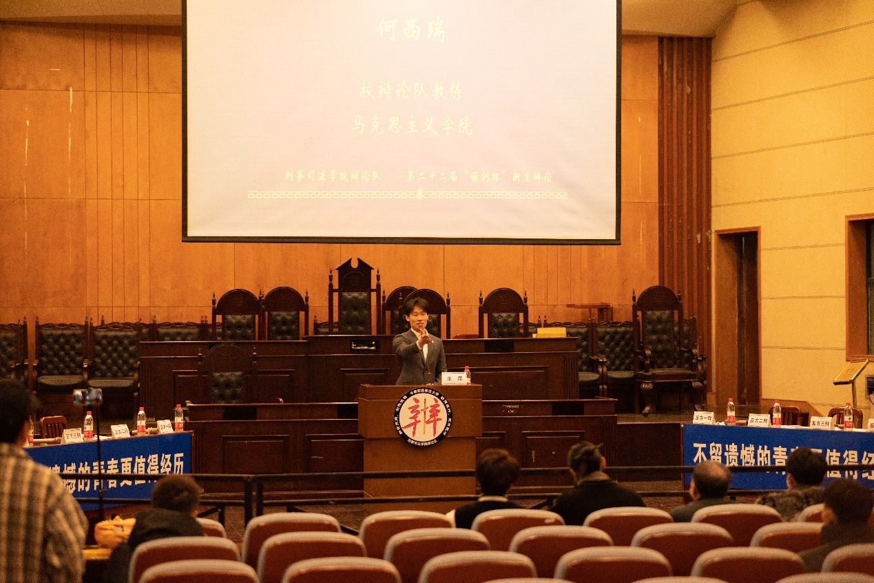 新闻网讯(学生记者 潘煜东 张泽同 郭宸祎) 群英荟萃展风采,妙语连珠辩中南,12月3日,永利集团88304官网第二十二届“砺剑杯”新生辩论赛决赛在文泰楼模拟法庭一拉开大幕。比赛双方就“留有遗憾还是不留遗憾的青春更值得经历 ”展开辩论。本次大赛特邀永利集团88304官网校辩论队教练何西瑞老师、新闻与文化传播学院19级辩论队队长毛小川同学、永利集团88304官网16级辩论队队长李家琪同学、17级队长张江海同学、19级队长周睿扬同学担任评委。