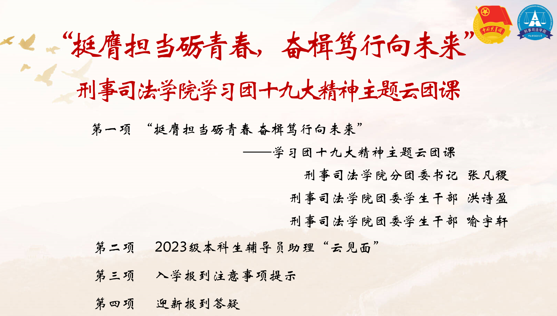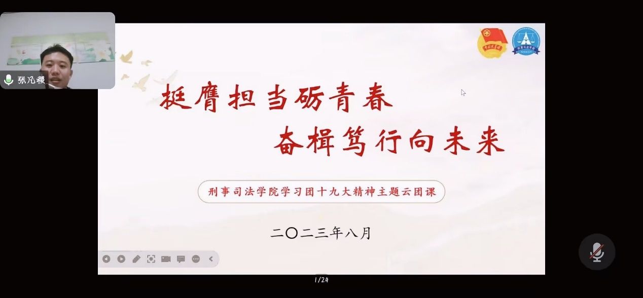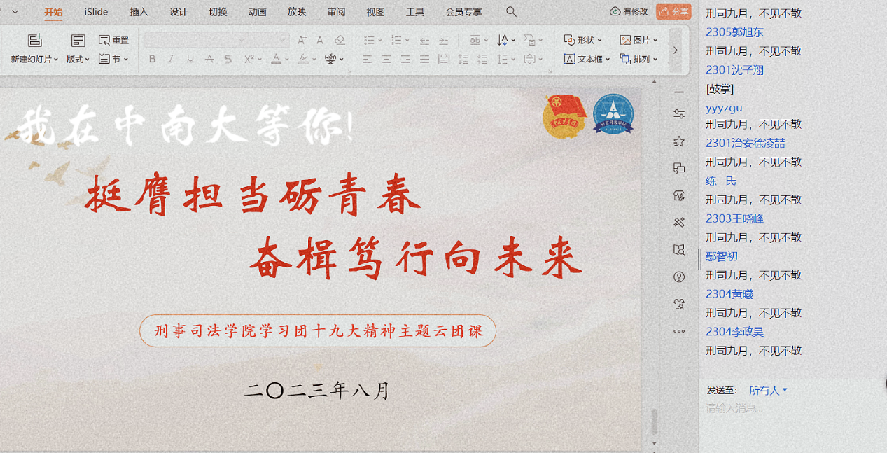 至此,“挺膺担当砺青春,奋楫笃行向未来”——永利集团88304官网学习团十九大精神主题云团课圆满结束,同学们纷纷在聊天框打出“刑司九月,不见不散”的字样。风好正是扬帆时,奋楫逐浪向未来,祝愿2023级新同学以梦为马,不负韶华,用这美好的四年时光去实现那些如阳光般耀眼的梦想!