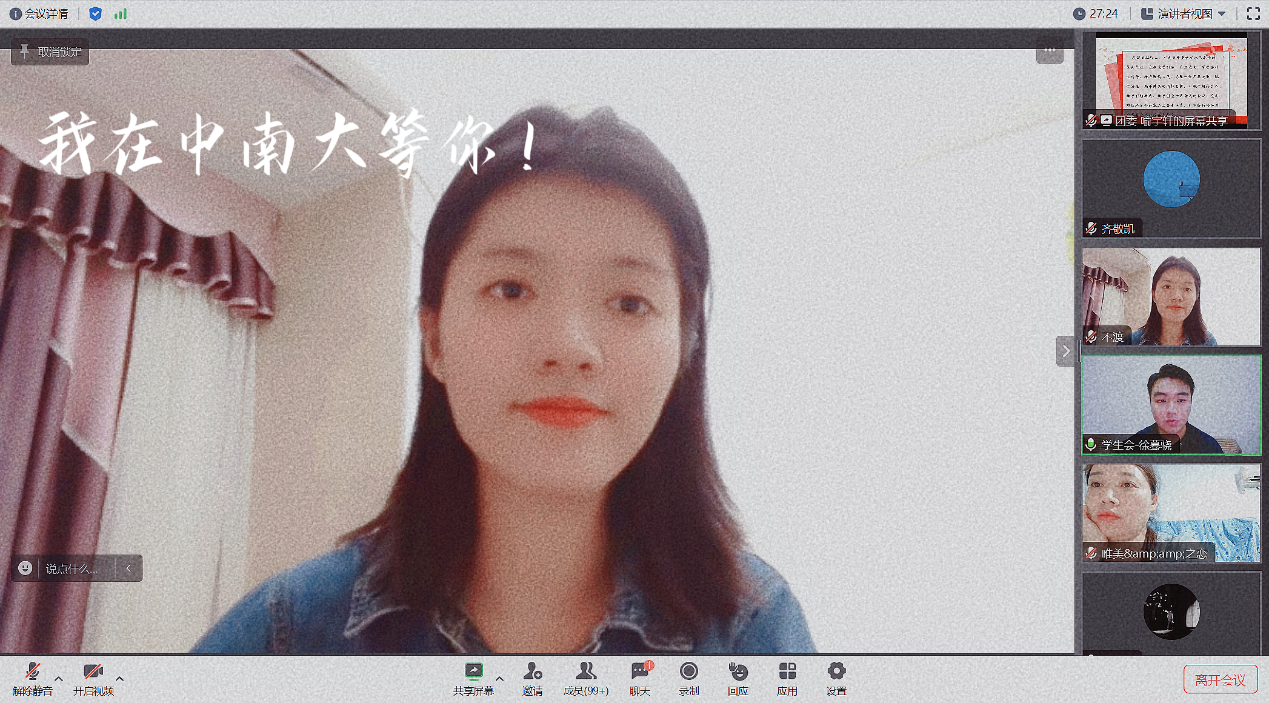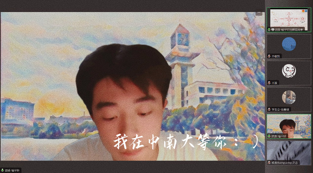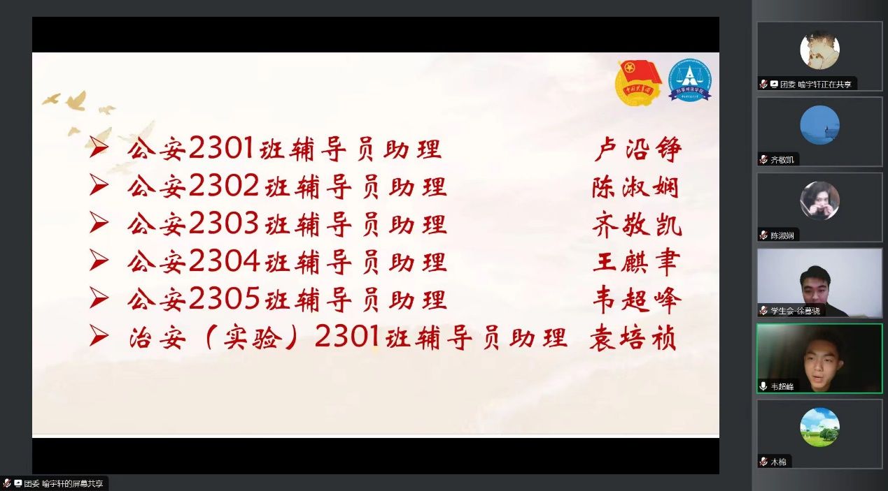 进入2023级新生辅导员助理“云见面”环节,来自2021级的卢沿铮、陈淑娴、齐敬凯、王麒聿、韦超峰、袁培祯六位同学分别进行了自我介绍,向即将开启大学征程的2023级新生表达了祝福和希望。永利集团88304官网2023级本科生辅导员黄文菊线上寄语新同学:欢迎亲爱的同学们来到永利集团88304官网!在这里,你们可以和志同道合的小伙伴们一起追逐梦想!四年时光,我将尽我所能,陪伴你们一路披荆斩棘、乘风破浪,希望你们追随信仰之光、扛起历史之责、不负时代之望,成为奋发进取、敢为人先的中南大青年!