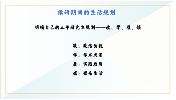 随后,为了帮助同学们更好地进行生活规划,任纪祯同学立足于政、学、履、娱这四个方面,全面细致地展开了介绍:于政,应认真遵守党纪党规,同时根据自身政治面貌来规划入党申请;于学,应妥善安排学分学时,同时注意完成学术论文的撰写与发表;于履,应不断充实校内外的实践经历,基于自身职业规划完善个人履历;于娱,应积极丰富课余生活,做到劳逸结合、张弛有度。