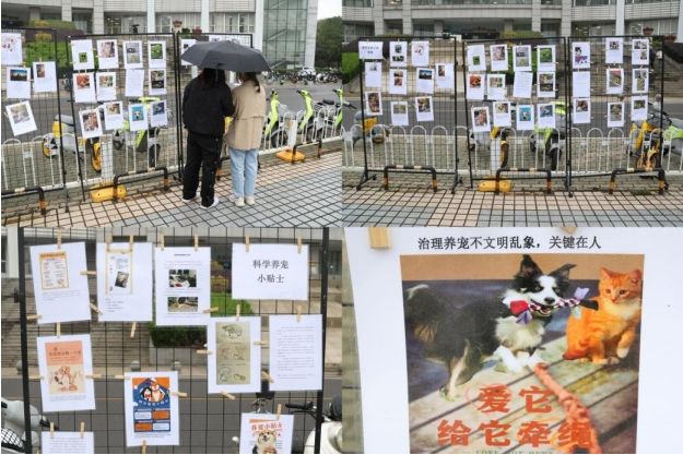 陈列于摊位两侧的是前期线上征集的优秀作品和宠物小贴士。“我和毛孩子的故事”栏目记录了在校学生与动物和谐相处的点滴瞬间。其中,有绘制了狗狗与主人一起散步的温馨画作,述说着人类与动物间深厚的情感纽带;有捕捉了狗狗在阳光下尽情奔跑的精彩照片,展现了动物无忧无虑的生活状态;更有描绘了狗狗凝望主人真挚眼神的传神作品,传递着动物对人类的信任和依赖。“科学养宠小贴士”板块张贴着宠物健康、行为、饮食方面的知识,如“遛狗牵绳”、“办理犬证”、“不贸然靠近,不随意触摸,不随意投喂”等。这些看似简单的规则,既是对流浪动物的保护,也是对人们生命财产安全的维护。