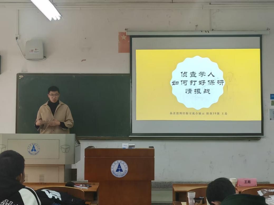 第二位进行经验分享的同学是保研至中国人民大学的王易同学。会中,王易同学以微观视角切入,从如何获得保研有利信息的角度,进行了主题为“侦察学人如何打好保研情报战”的经验分享。通过一番讲解,王易同学从保研情报战是什么、为什么要打与怎么打三个方面讲述自己保研过程中的奋斗经验,分享了自己制定奋斗路径与达成目标的思维逻辑,展示了他创新、灵活的保研应变思路。