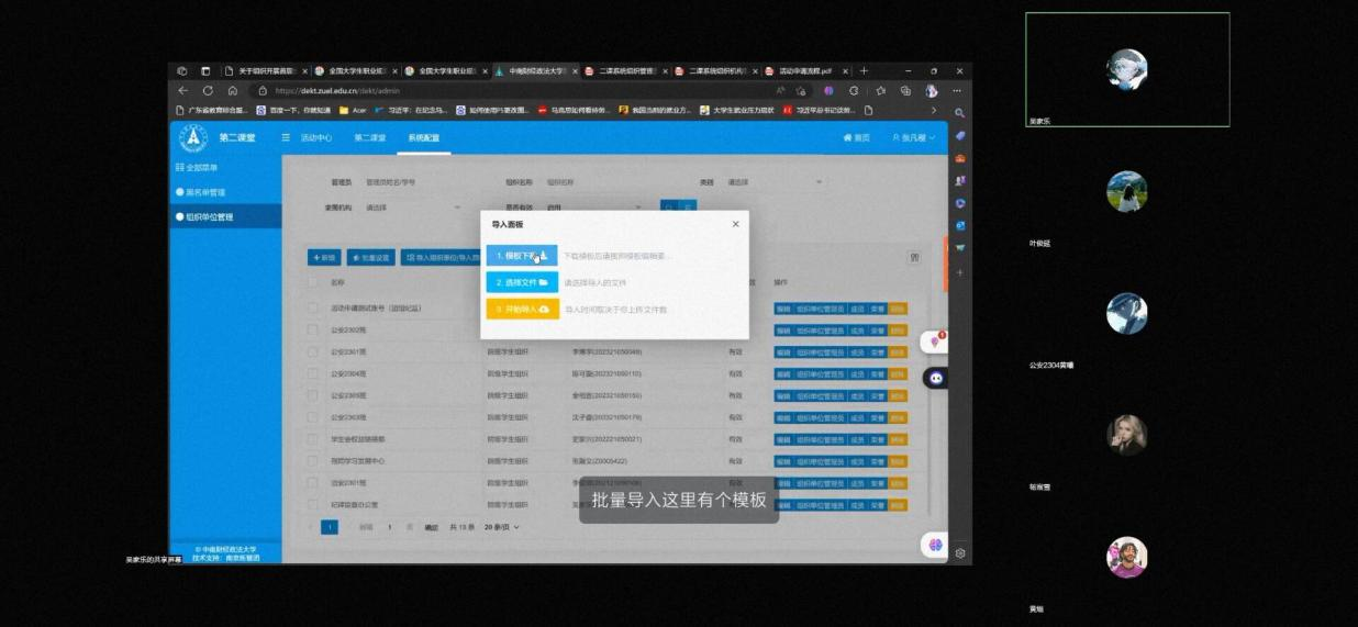 本次培训会主要包括系统介绍、高级功能操作演示和线上提问三个环节。开场致辞中,宣讲人吴家乐强调了二课系统在学生工作中的重要性,随着二课系统的更新,团学组织干部需要不断学习和适应新的系统和工具操作方法,以便于更高效地完成学生工作。