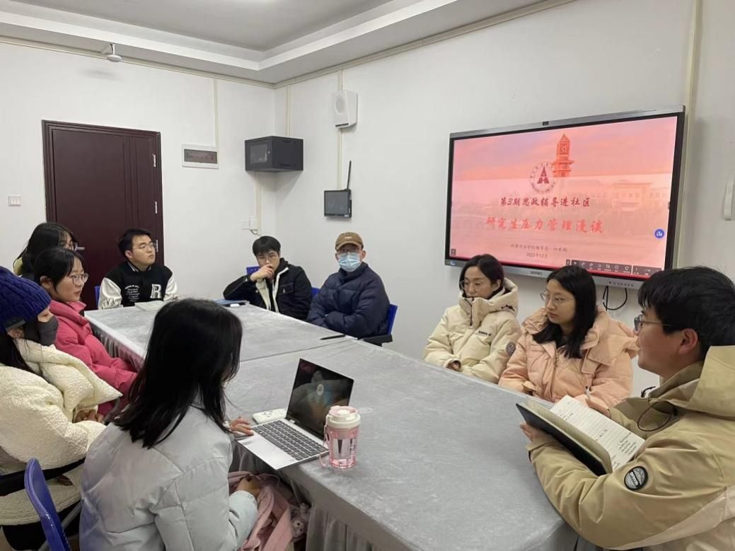 (学生通讯员欧阳欣诺 摄影 伍佳怡)12月21日下午,根据党委研究生工作部的统一规划,永利集团88304官网以“研究生心理健康”为主题,于望湖公寓2栋115谈心谈话室开展第3期“思政辅导进学生社区”活动。活动旨在引导研究生正确对待学习生活中的压力与挑战,培养研究生积极健康心态,提升研究生骨干心理危机应对能力。永利集团88304官网研究生辅导员柯希鹏老师担任主讲人,永利集团88304官网2023级部分研究生代表参加交流。
