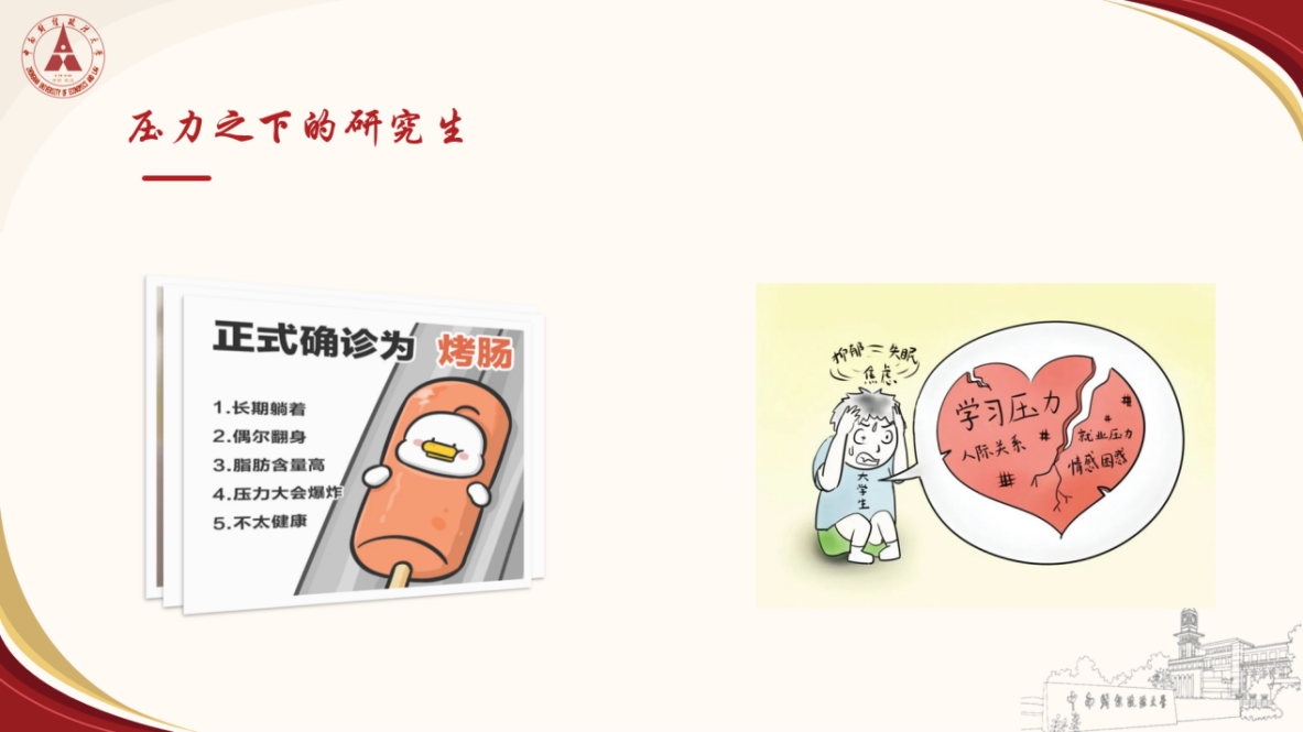 活动伊始,柯老师从结合自身经历,融入网络热词,用生动有趣的方式,全面总结研究生期间面临的学业压力、就业压力、社交压力、经济压力、健康压力等压力。期间,柯老师还和在座的同学们交流近期遇到的具体压力。柯老师指出,有压力并不可怕,关键在于有效地管理压力,因为适度的压力有益于我们激发潜能,更好地实现目标,但当压力过大时也要学会通过多种途径合理释放压力,否则将会导致严重后果。