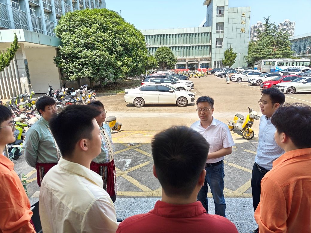 千锤百炼,臻于至善,经过无数次打磨,《阳光下的麦盖提》终于到了登台亮相的时刻。比赛当天中午,舞团成员们收到了一份特殊的礼物——院党委书记张志刚与分团委书记张凡稷亲临南湖会堂进行亲切的慰问。张志刚书记在观看彩排后,对刑司舞团提出高度赞扬,他表示,《阳光下的麦盖提》将跃动的青年气息和奔涌的青春热情相结合,同学们同心协力的精神以及不怕困难的斗志,展现永利官网学子昂扬向上的风采,祝愿刑司舞团在此次大赛中披荆斩棘、再创佳绩。