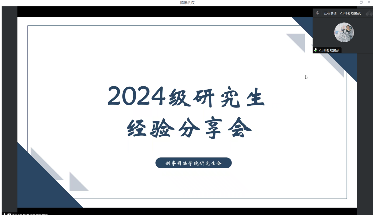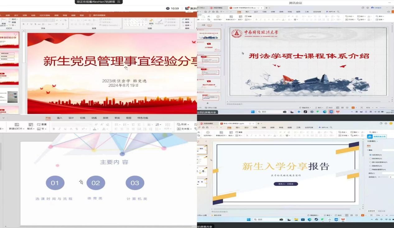 会议伊始,蚁俊彦同学就导师选择、选课分班和奖学金政策进行分享,同时向新生们介绍了学院研究生会以及班委和支委的各项职务;韩竞逸同学从组织关系转接、档案审查和材料补办等角度,为党员管理事宜提供详尽指导;江佳霖同学以刑法学为视角深入解析硕士课程体系;毛诺言同学则为大家展示永利集团88304官网丰富的特色课程。